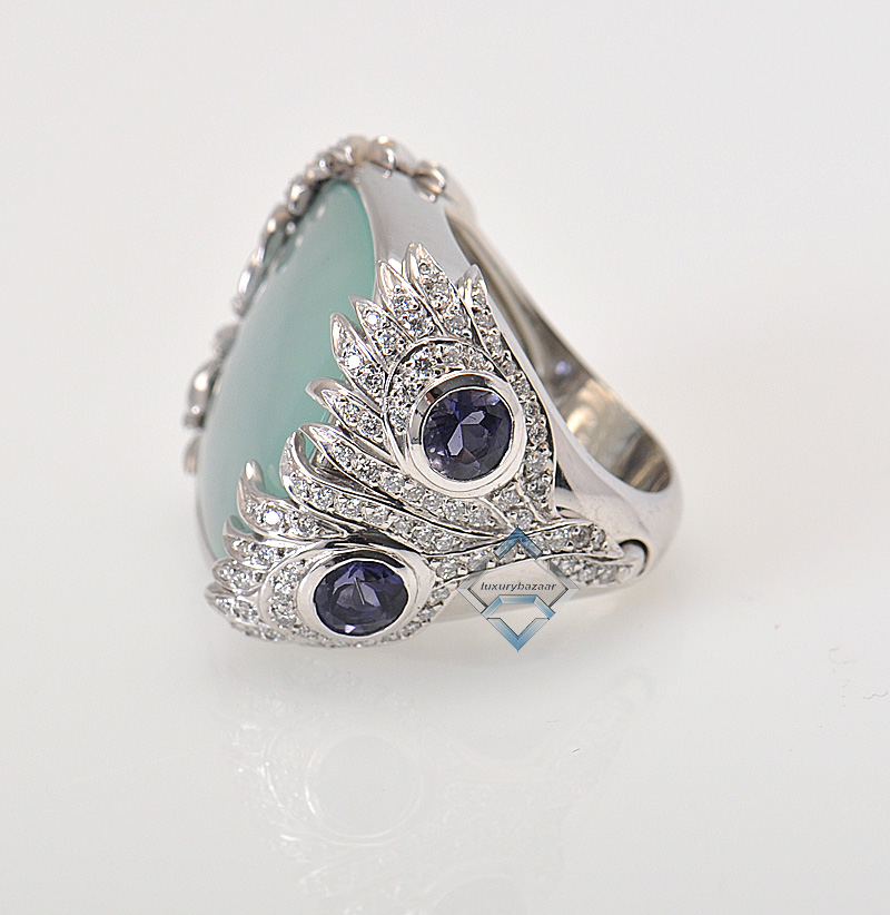 Белое золото, бриллианты, иолит, зеленый халцедон.