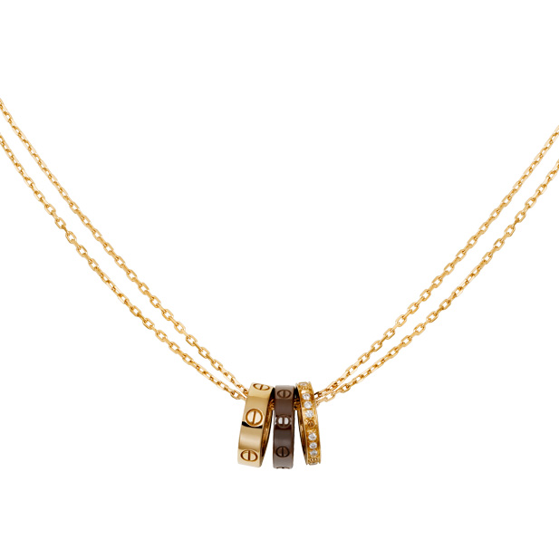 Описание Три кольца на двойной цепочке из розового золота, два кольца из розового золота 18 карат (одно из них с бриллиантами) и одно кольцо из керамики коричневого цвета. Регулируемая длина цепочки от 38 до 41 см.