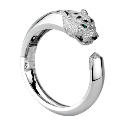 Описание Браслет из белого золота 18 карат с мотивом "пантера", бриллианты (голова и хвост), оникс (нос и пятна), изумруды (глаза)