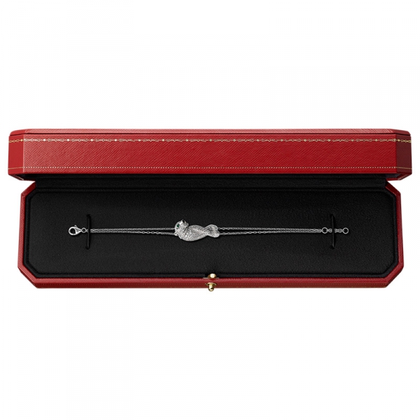 Описание Браслет из белого золота 18К с подвеской в ??форме пантеры с бриллиантовым паве 233 бриллианта, 2 изумруда (глаза), черный лак (нос) Высота подвески: 26 мм x ширина: 6,7 мм