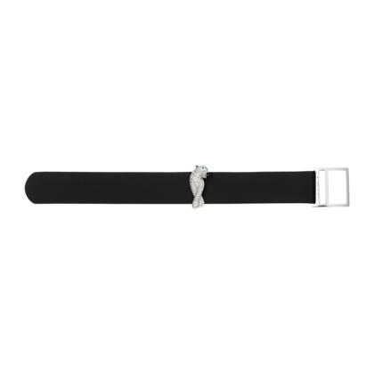 Описание "Браслет из белого золота 18 карат с бриллиантами, мотив" пантера ", изумруды (глаза) и оникс (нос), переливающаяся коричневая ткань Регулируемая длина Браслета от 15,5 до 17,5 см "