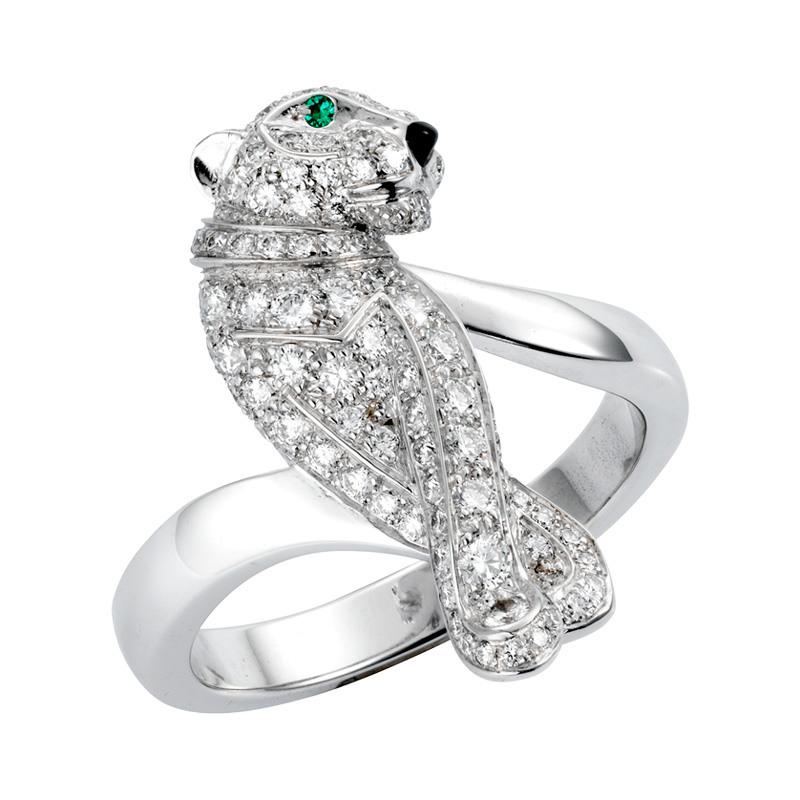 Описание Кольцо из белого золота 18 карат, мотив "пантера" с отделкой бриллиантами, изумруды (глаза) и черный лак (нос)
