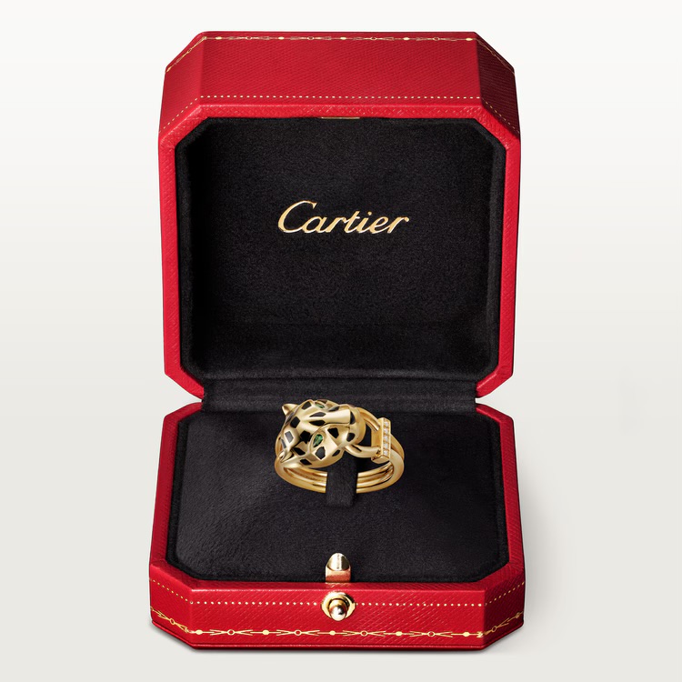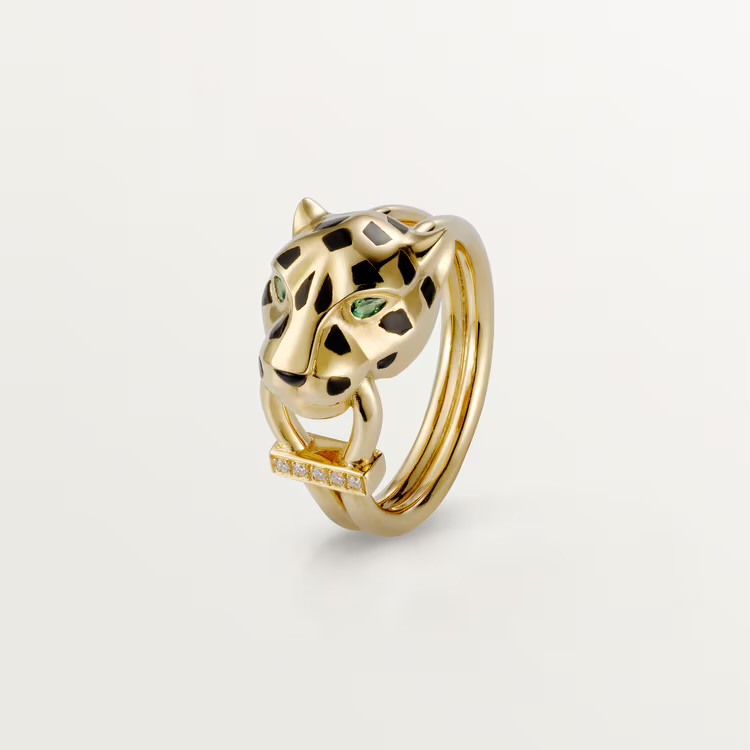 Описание Кольцо из желтого золота 18 карат, бриллианты, мотив "пантера", гранат-цаворит (глаза), оникс и черный лак (нос)