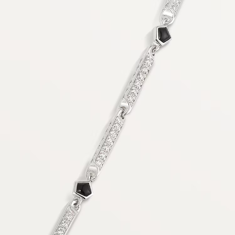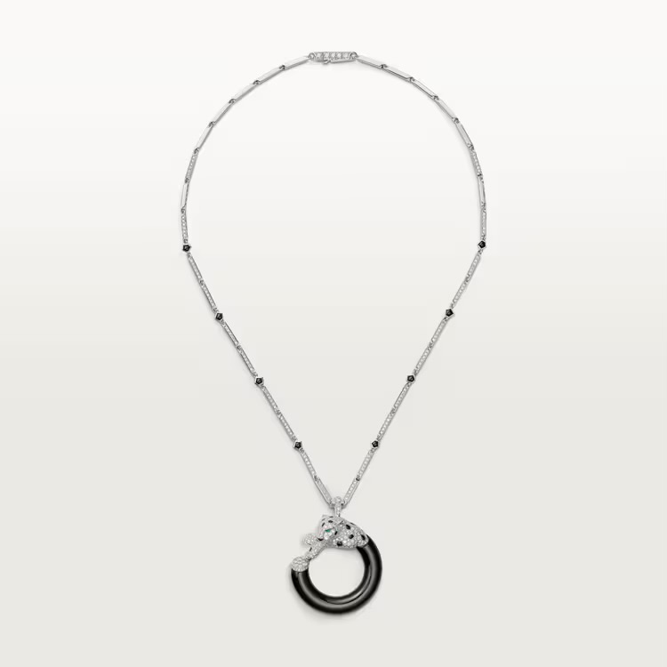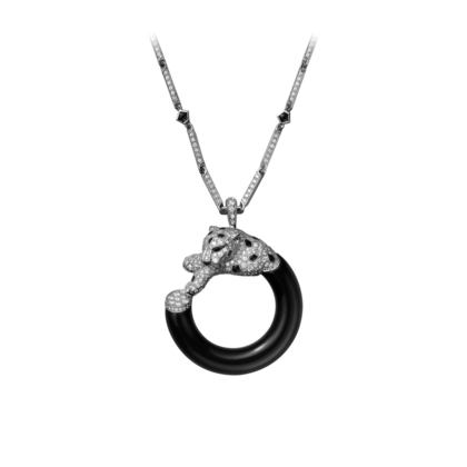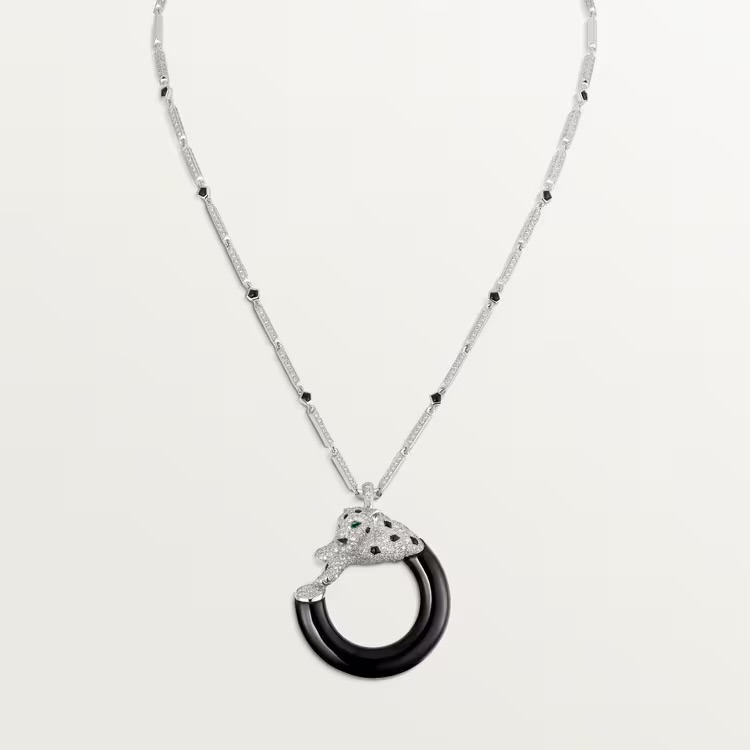 Описание колье Panth?re de Cartier, Белое золото 18 карат, 614 бриллиантов классической огранки общим весом 4,23 карата, изумруды, оникс