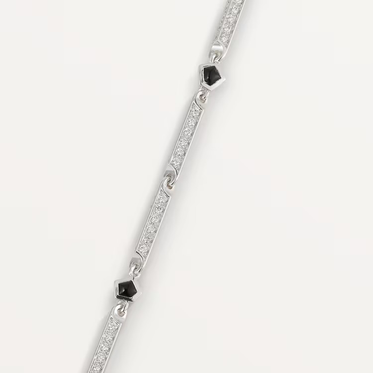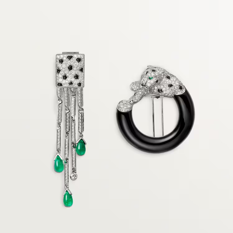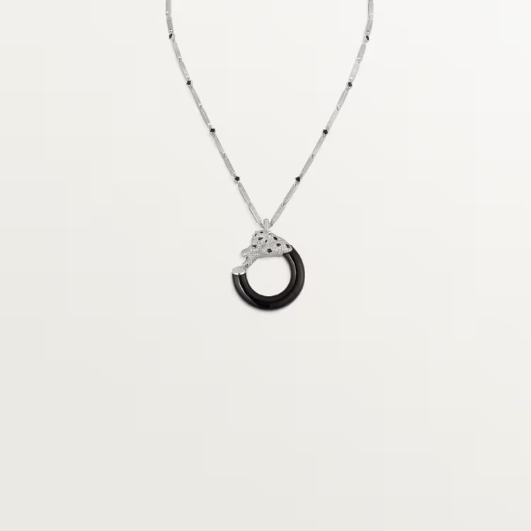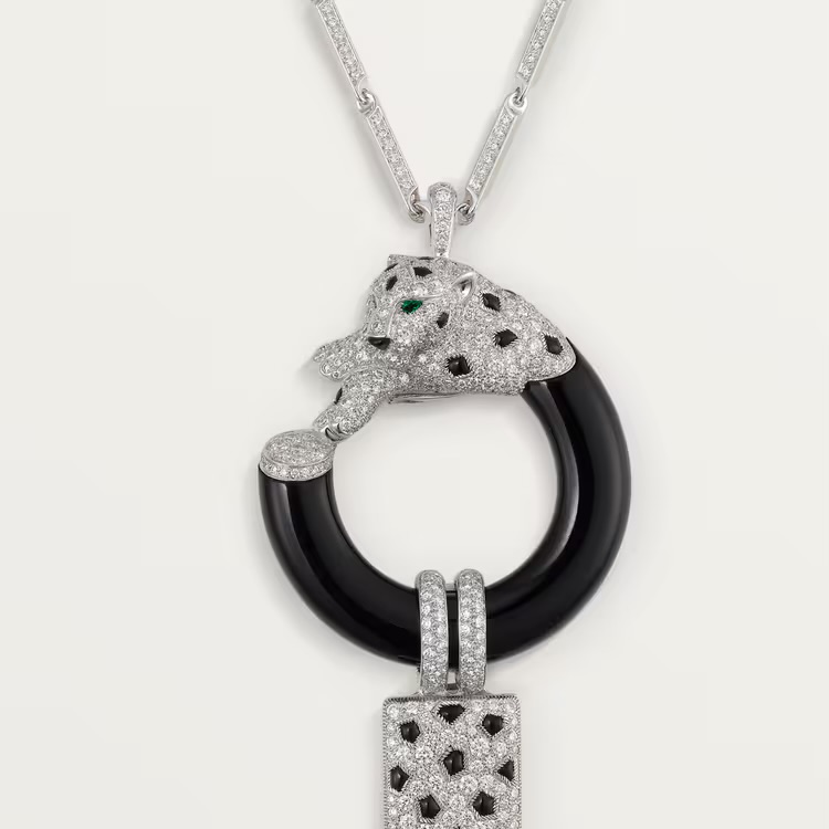 Описание колье Panth?re de Cartier, Белое золото 18 карат, 817 бриллиантов классической огранки общим весом 5,92 карата, 5 изумрудов, оникс