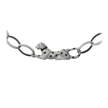 Описание колье Panth?re de Cartier, Белое золото 18 карат, черный лак, 501 бриллианты классической огранки общим весом 2,65 карата, изумруды, оникс