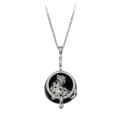 Описание Колье из белого золота 18 карат с бриллиантами и подвеской из черного нефрита с фигуркой пантеры Оникс (пятна), оникс (нос), изумруды (глаза) Длина колье: 65 см Высота подвески: 3 см
