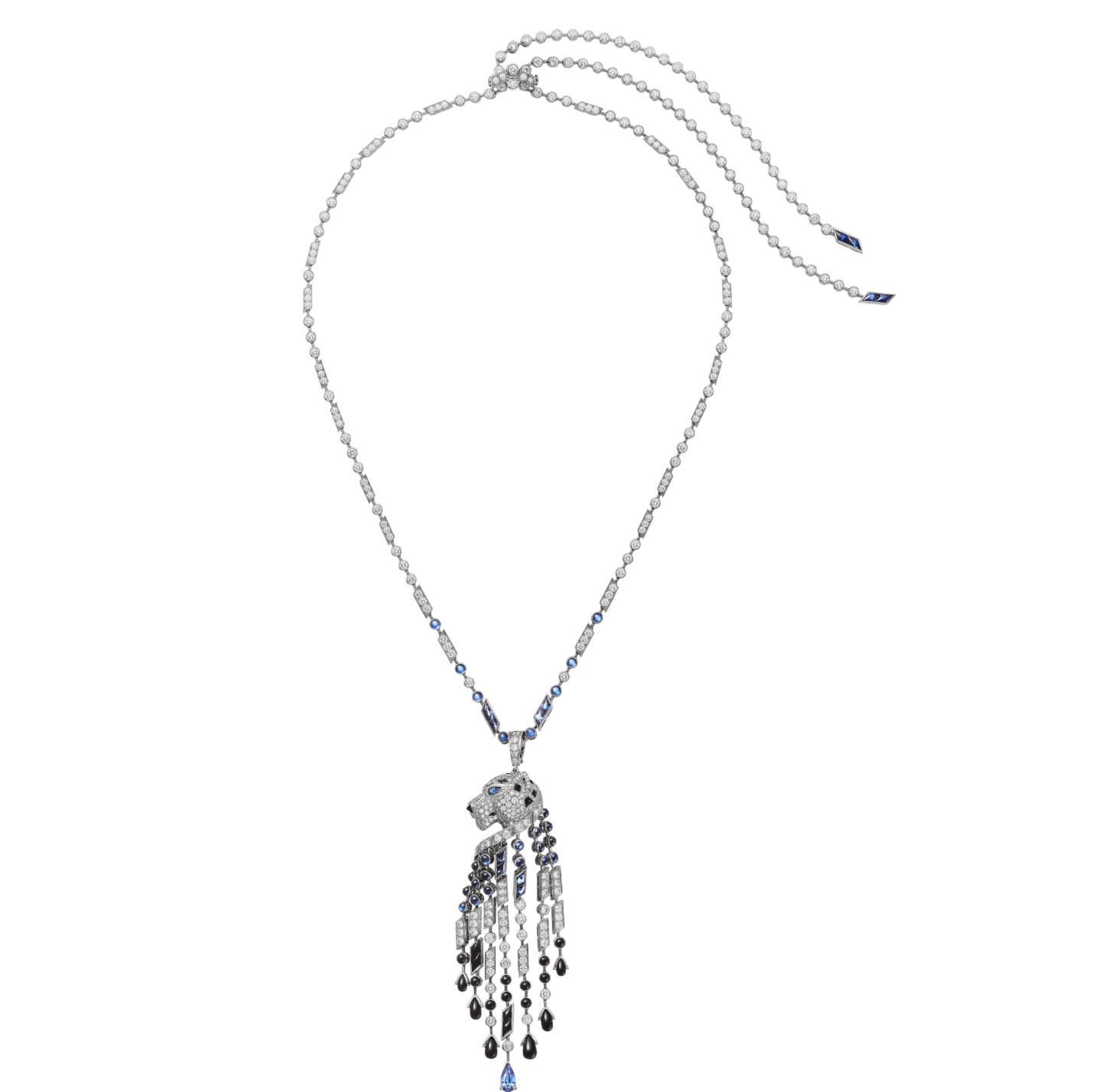 Описание Колье из платины 950 ‰ с отделкой бриллиантами, оникс (нос), сапфири (глаза), сапфири и оникс (кисти), сапфири и ониксы в форме капель. Длина цепочки: 45,5 см. Размер мотива: длина 90 мм, ширина 2