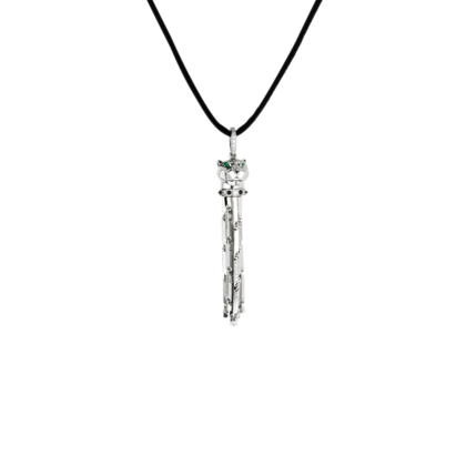 Описание Подвеска из белого золота 18 карат, бриллианты, изумруды (глаза), оникс (нос), черный лак (пятна), черный шнурок.
