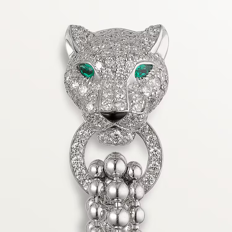 Описание Серьги Panthere de Cartier, Белое золото 18 карат, 252 бриллианта классической огранки общим весом 1,48 карата, изумруды (глаза), оникс