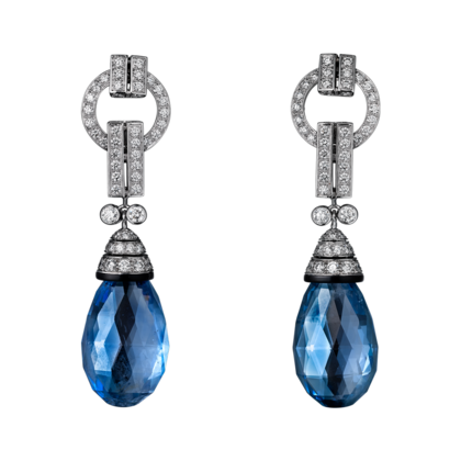 Описание Серьги, платина, два огранки сапфира "бриолет" весом 40,76 карата, оникс, бриллианты классической огранки.