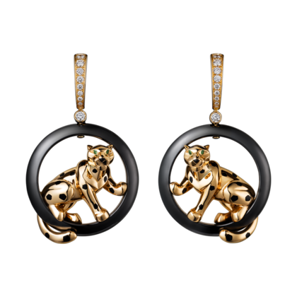 Описание Серьги из желтого золота 18 карат с подвесками в виде керамических колец с фигурками пантеры Черный лак (пятна), оникс (нос), гранаты-цавореты (глаза), бриллианты