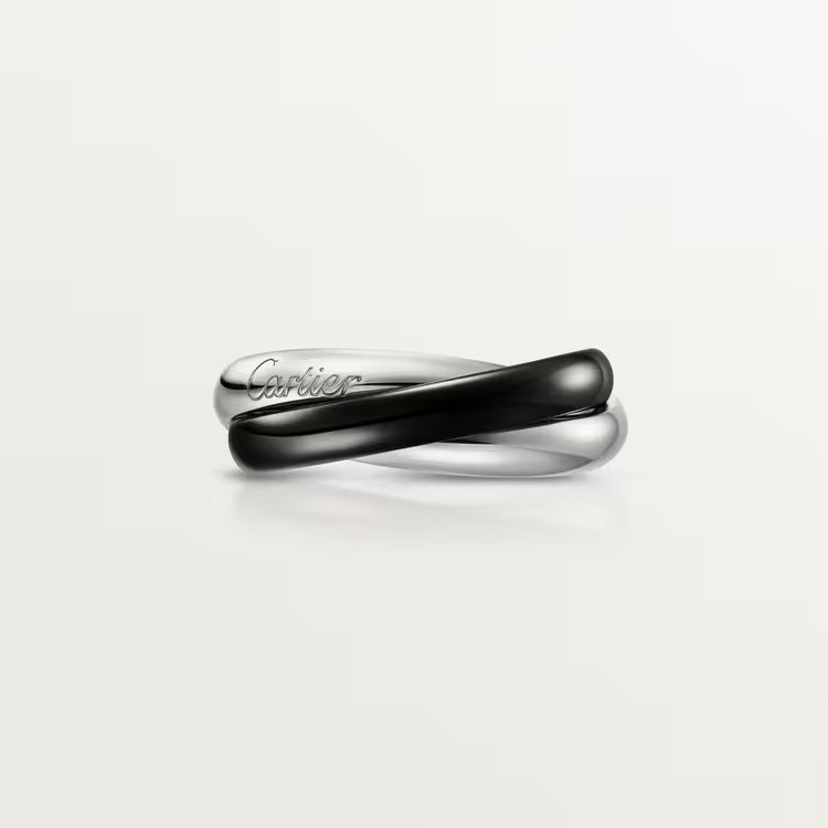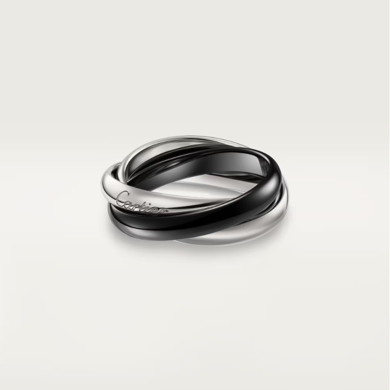 Описание Кольцо из белого золота 18 карат, два кольца из белого золота, одно из черной керамики. Ширина каждого кольца: 3,5 мм.