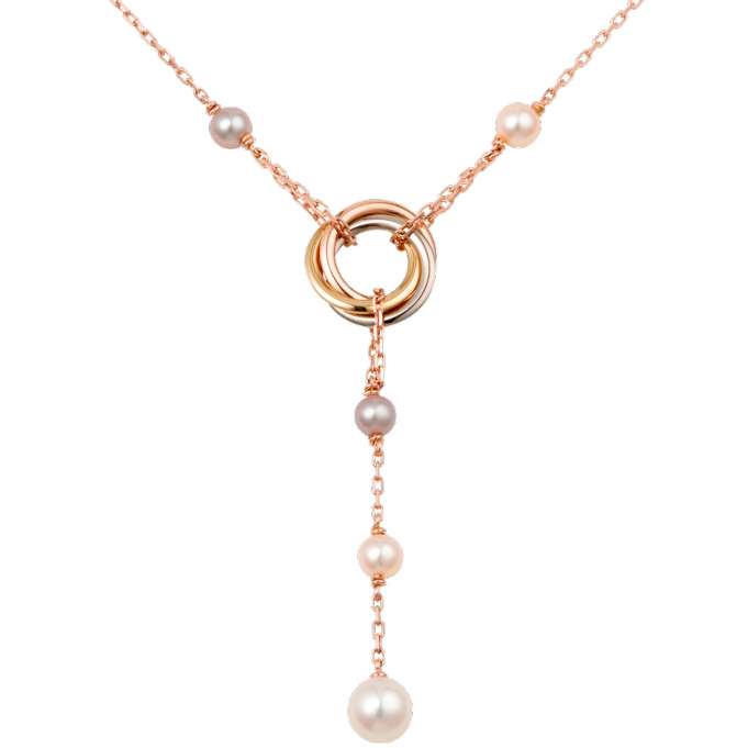 Описание колье Trinity de Cartier, Белое золото 18 карат, розовое золото 18 карат, желтое золото 18 карат, 9 речных культивируемых жемчужин