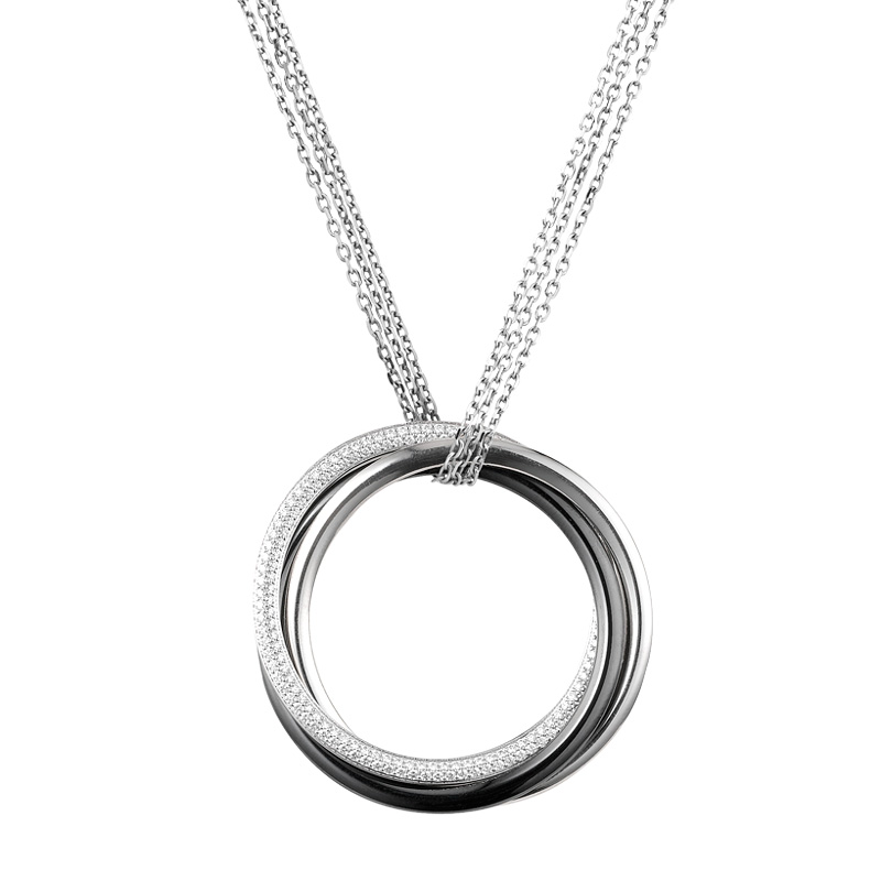 Описание Подвеска из белого золота 18 карат из трех колец: одно кольцо украшено 166 бриллиантами, одно выполнено из белого золота, одно – из черной керамики Диаметр мотива: 37 мм Размер цепочки: 55 мм Регулируемая длина цепочки от 39 до 42 см