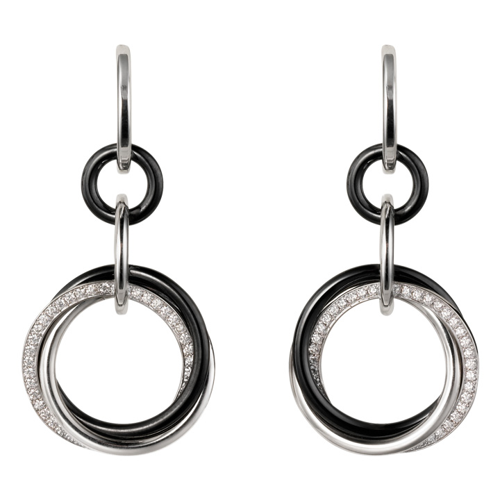 Описание Серьги из белого золота 18 карат из трех колец: одно кольцо украшено 88 бриллиантами, одно выполнено из белого золота, одно – из черной керамики Диаметр мотива: 19 мм Длина: 43 мм