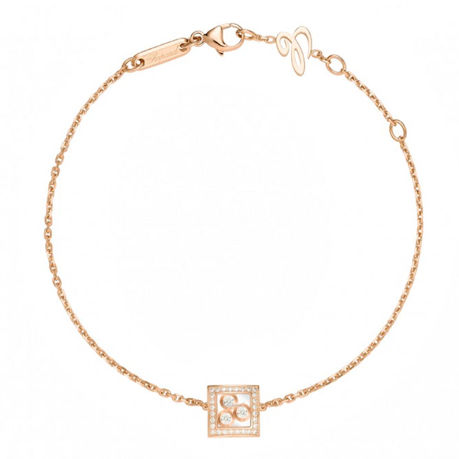 Браслет Chopard Happy Diamonds Icons ref: 859224-5002 из розового золота 750 пробы с бриллиантами (0,16 карат), плавающие бриллианты свободно скользят между сапфировыми стеклами.