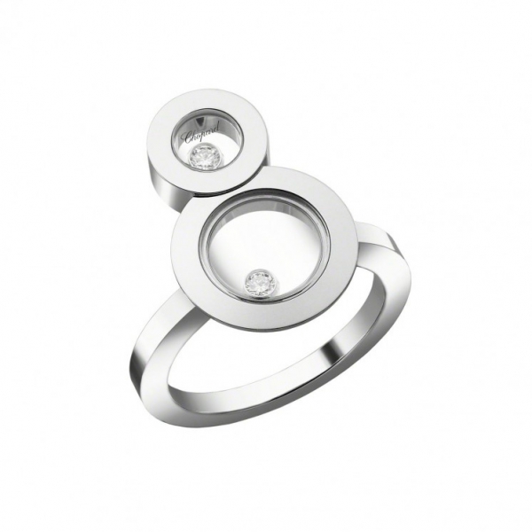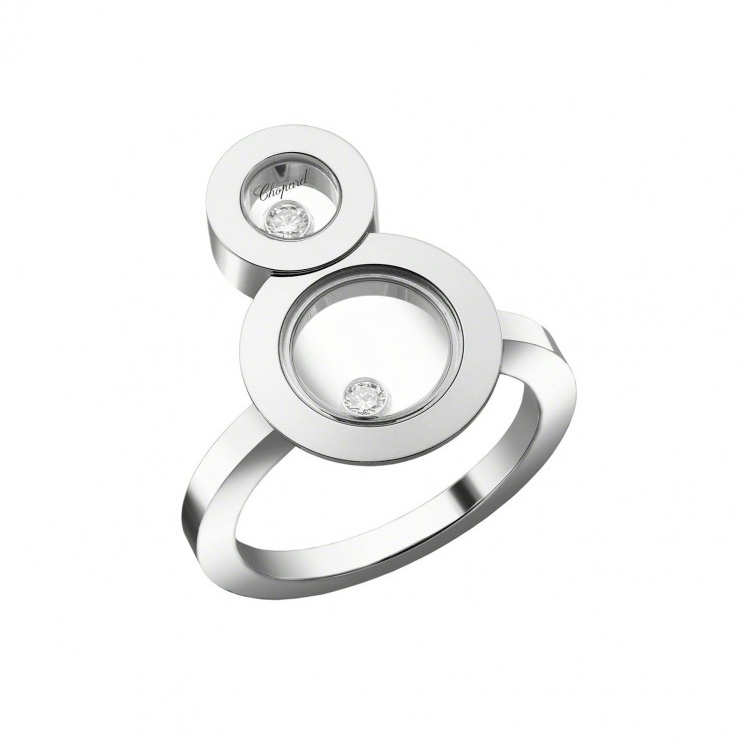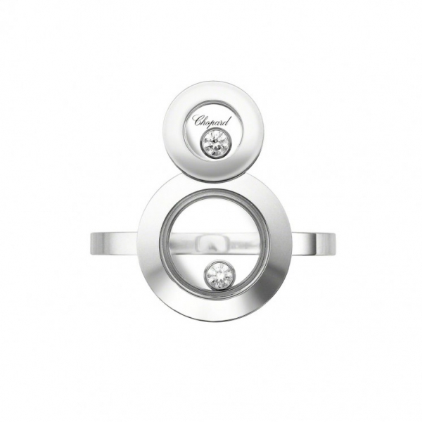 Кольцо Chopard Happy 8 ref: 829209-1010 из белого золота 750 пробы с бриллиантами (0,10 карат), которые свободно скользят между сапфировыми стеклами.