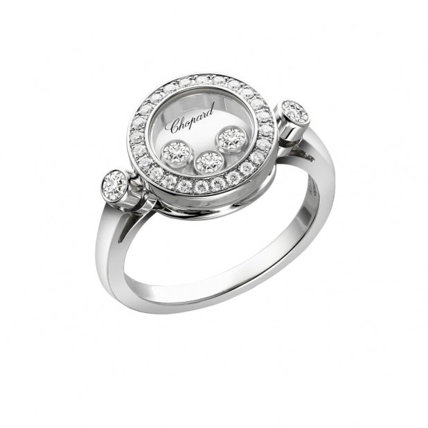 Кольцо Chopard Happy Diamonds Icons ref: 823957-1110 из белого золота 750 пробы с бриллиантами (0,39 карат), плавающие бриллианты свободно скользят между сапфировыми стеклами.