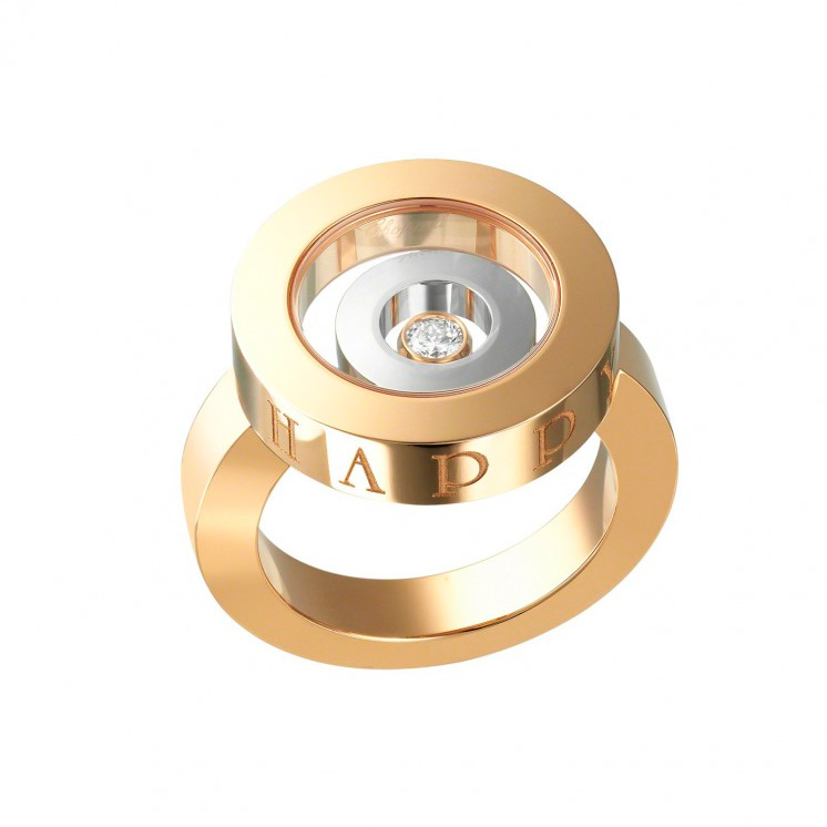 Кольцо Chopard Happy Spirit ref: 825405-9110 из розового и белого золота 750 пробы с бриллиантом (0,10 карат), который свободно скользит между сапфировыми стеклами.