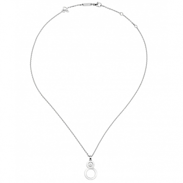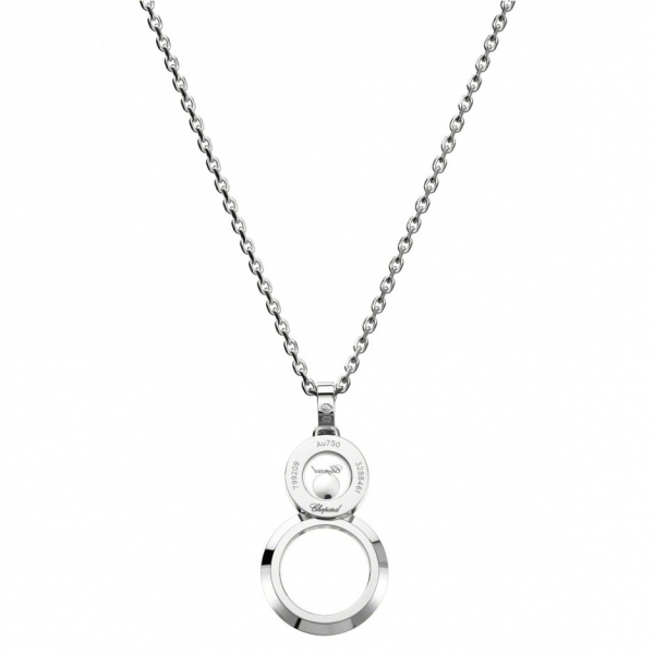 Подвеска Chopard Happy Diamonds 8 ref: 799209-1001 из белого золота 750 пробы с бриллиантом (0,05 карат), который свободно скользит между двумя сапфировыми стеклами.