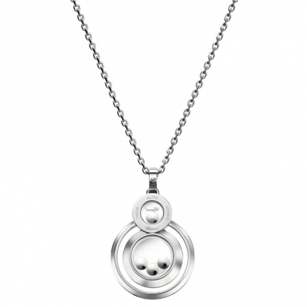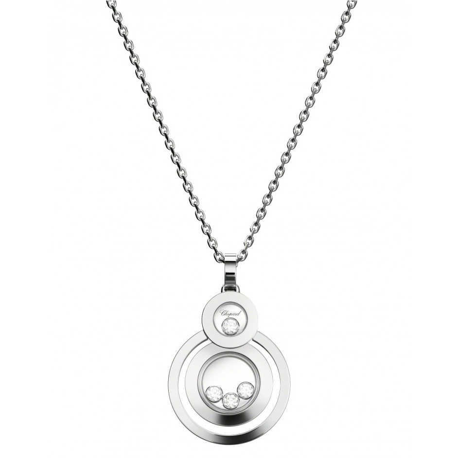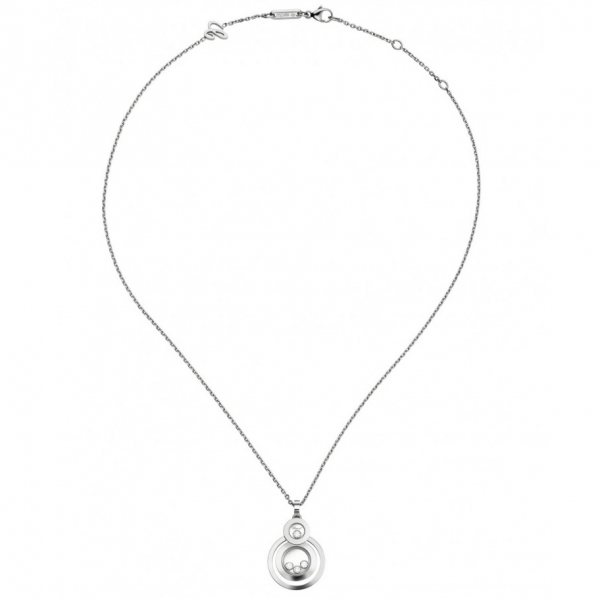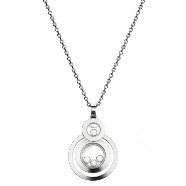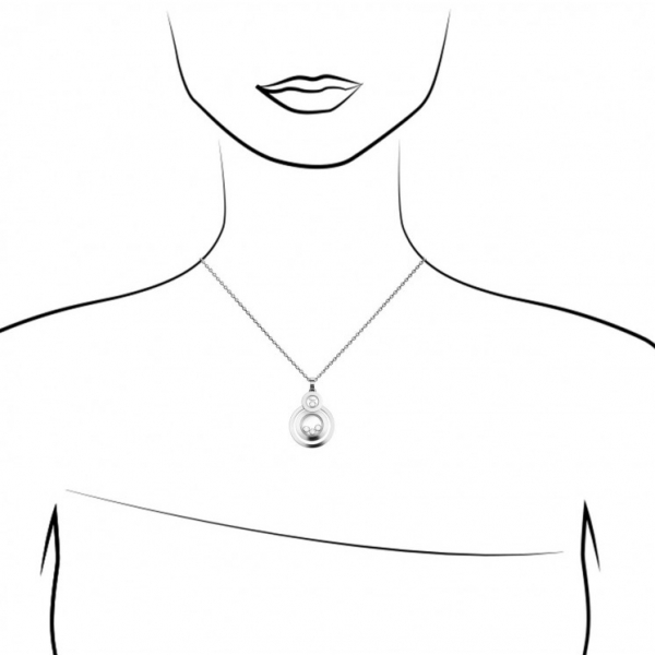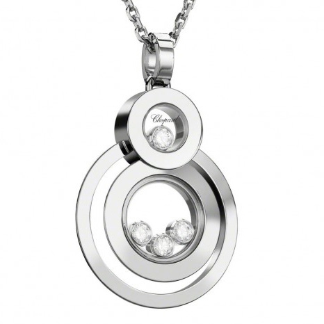 Подвеска Chopard Happy Diamonds 8 ref: 799210-1001 из белого золота 750 пробы с бриллиантами (0,20 карат), которые свободно скользят между двумя сапфировыми стеклами.