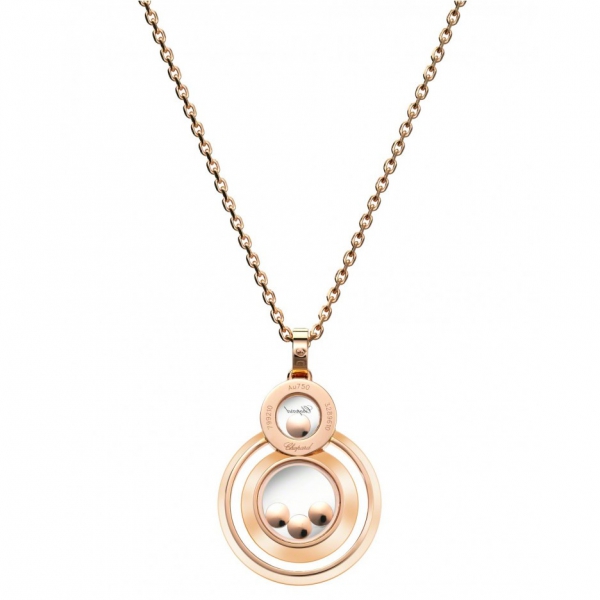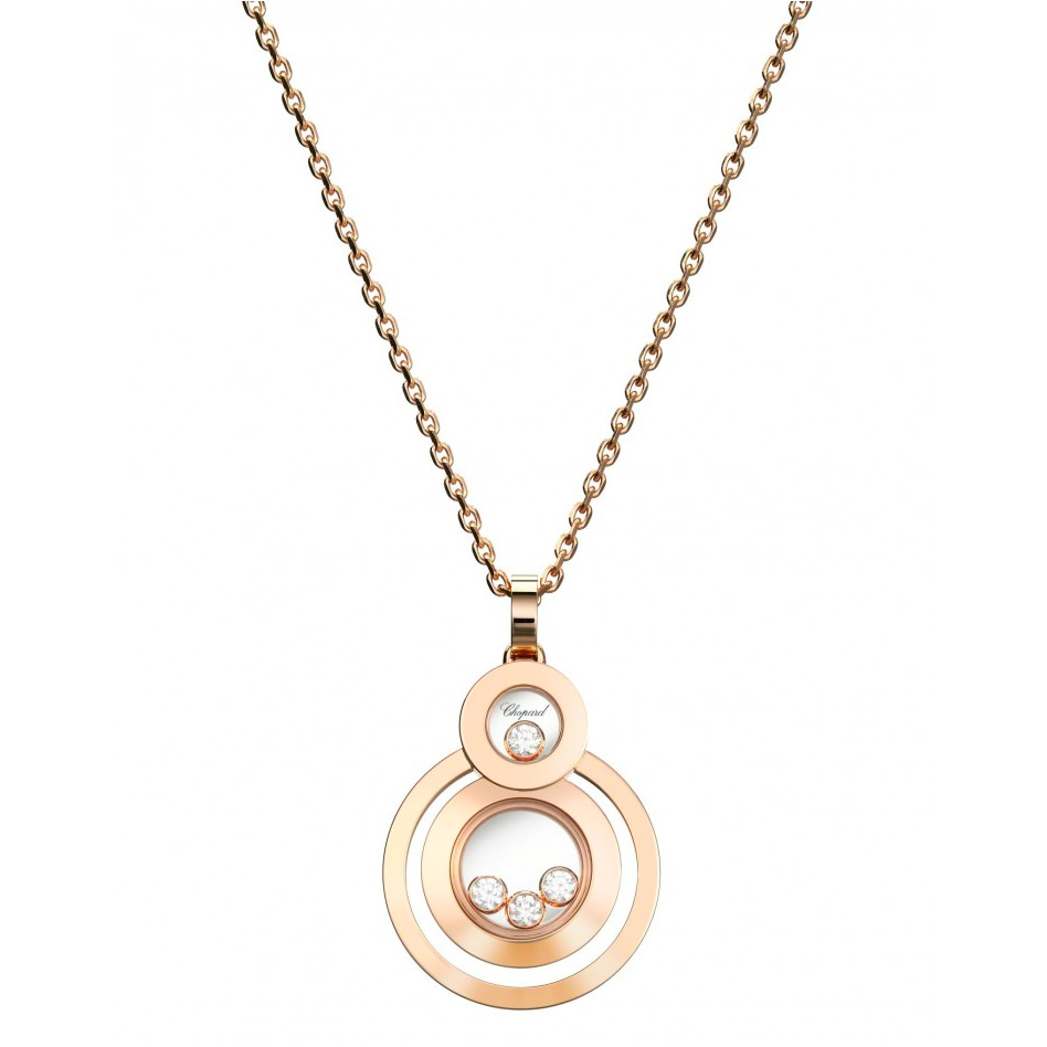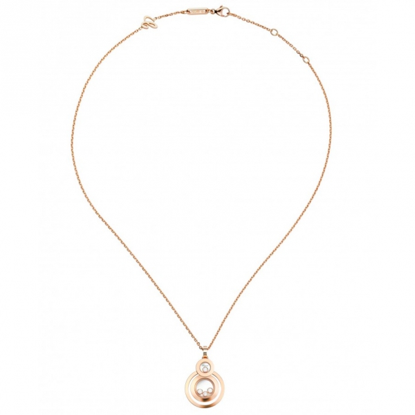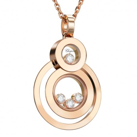 Подвеска Chopard Happy Diamonds 8 ref: 799210-5001 из розового золота 750 пробы с бриллиантами (0,20 карат), которые свободно скользят между двумя сапфировыми стеклами.