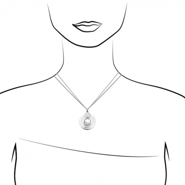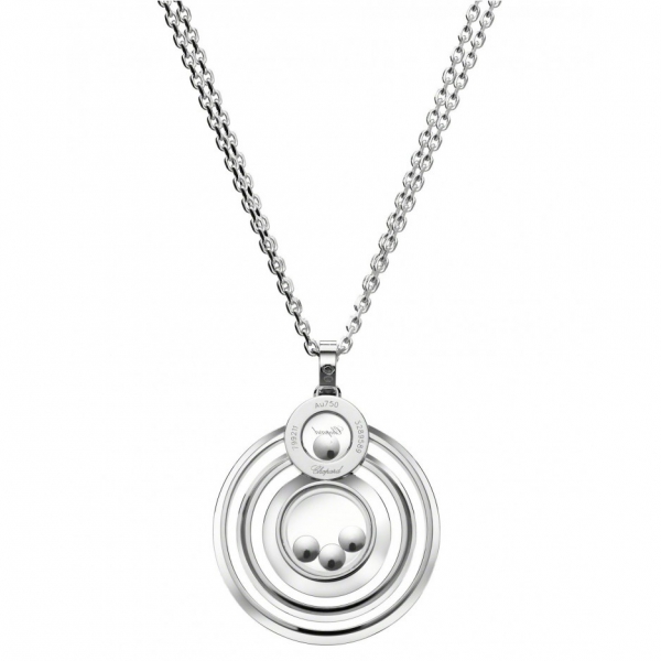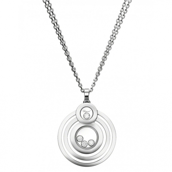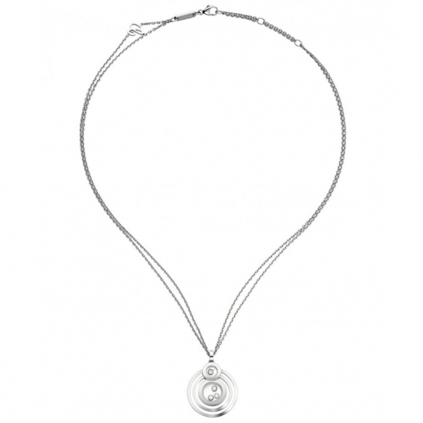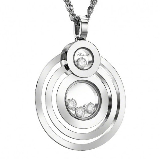 Подвеска Chopard Happy Diamonds 8 ref: 799211-1001 из белого золота 750 пробы с бриллиантами (0,20 карат), плавающие бриллианты свободно скользят между двумя сапфировыми стеклами.