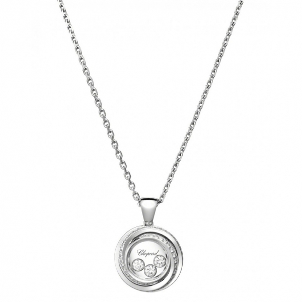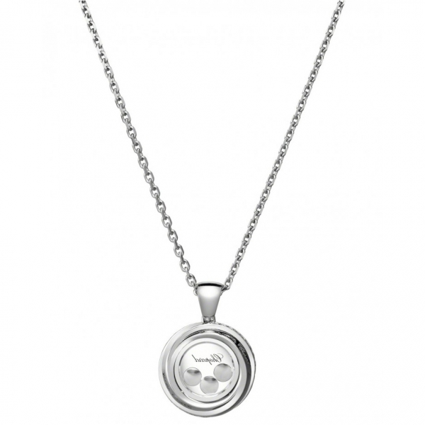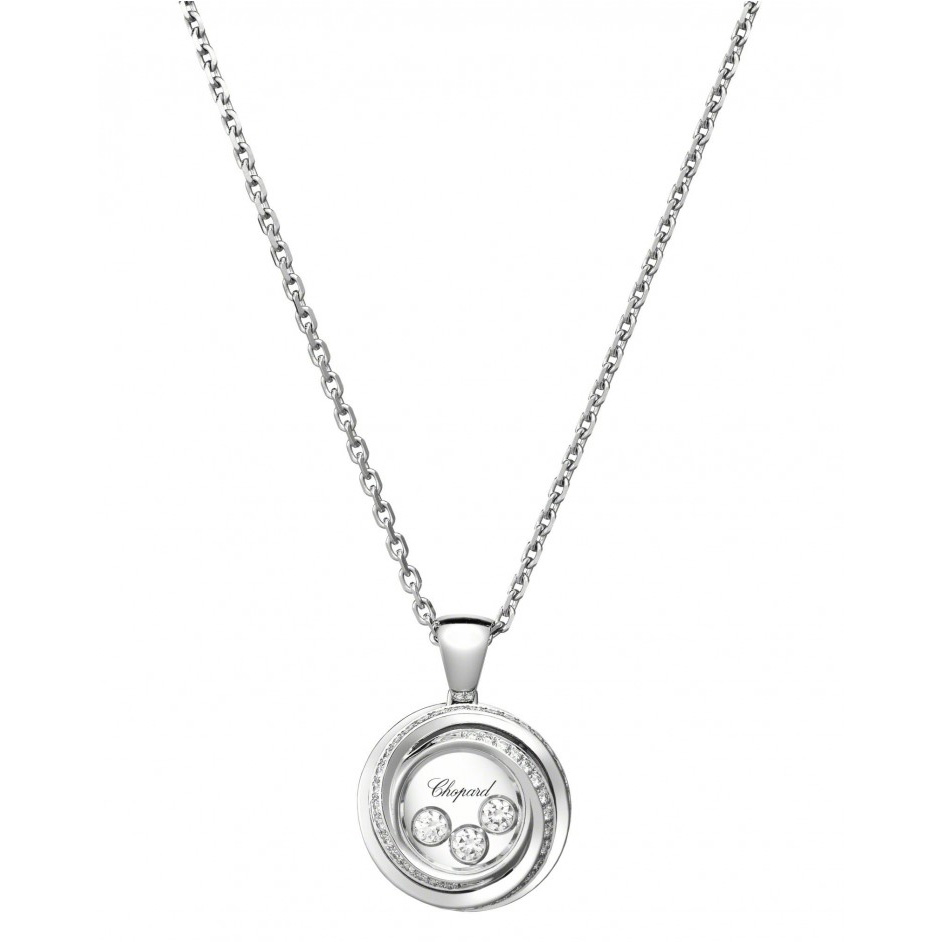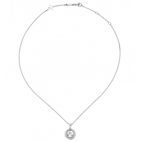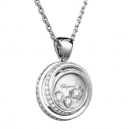 Подвеска Chopard Happy Diamonds Emotion ref: 799216-1003 из белого золота 750 пробы с бриллиантами (0,42 карат), плавающие бриллианты свободно скользят между двумя сапфировыми стеклами.