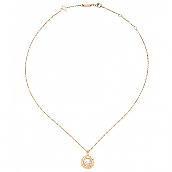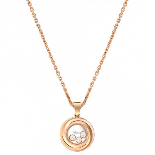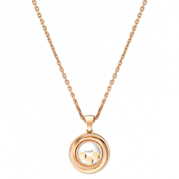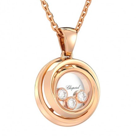Подвеска Chopard Happy Diamonds Emotion ref: 799216-5001 из розового золота 750 пробы с бриллиантами (0,15 карат), которые свободно скользят между двумя сапфировыми стеклами.