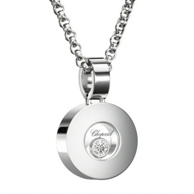 Подвеска Chopard Happy Diamonds Icons ref: 793086-1001 из белого золота 750 пробы с бриллиантом (0,05 карат), который свободно скользит между двумя сапфировыми стеклами.