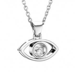 Подвеска Chopard Happy Diamonds Icons ref: 797863-1001 из белого золота 750 пробы с бриллиантом (0,05 карат), который свободно скользит между двумя сапфировыми стеклами.
