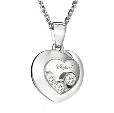 Подвеска Chopard Happy Diamonds Icons ref: 799203-1001 из белое золота 750 пробы с бриллиантами (0,13 карат), которые свободно скользит между двумя сапфировыми стеклами.