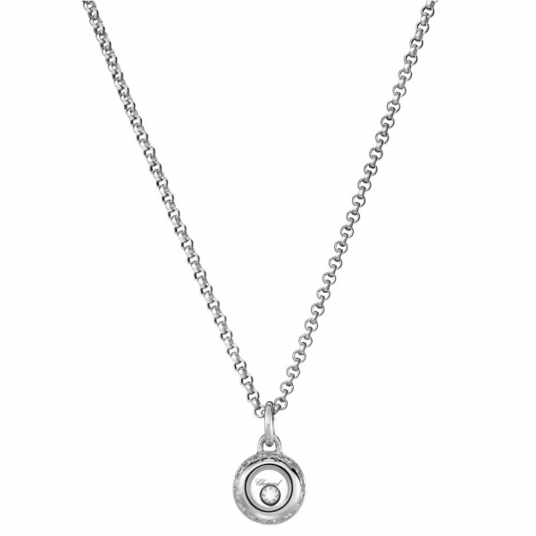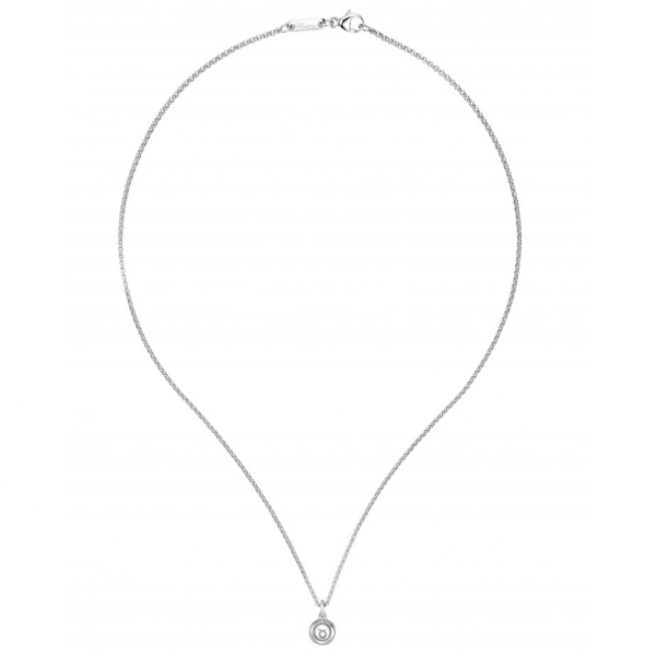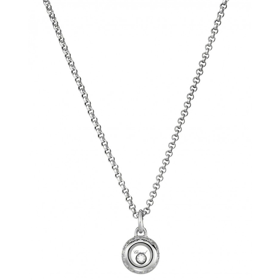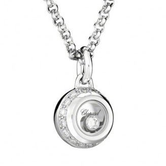 Подвеска Chopard Happy Diamonds Miss Happy ref: 799012-1001 из белого золота 750 пробы с бриллиантами (0,14 карат), плавающий бриллиант свободно скользит между двумя сапфировыми стеклами.