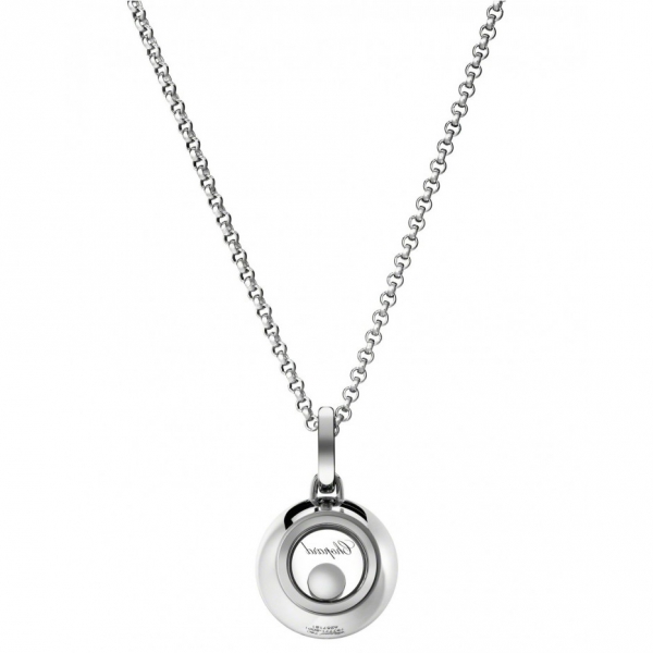 Подвеска Chopard Happy Diamonds Very ref: 797771-1001 из белого золота 750 пробы с бриллиантом (0,10 карат), который свободно скользит между двумя сапфировыми стеклами.