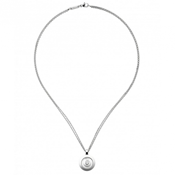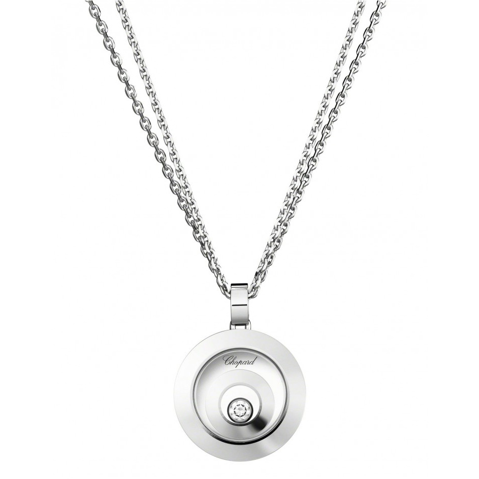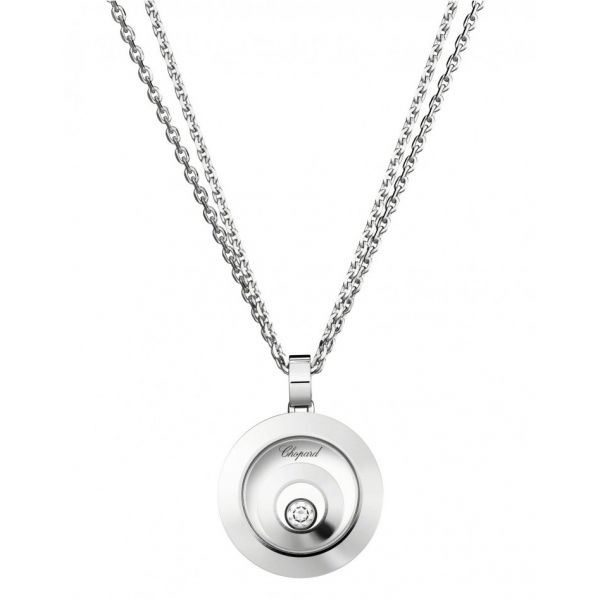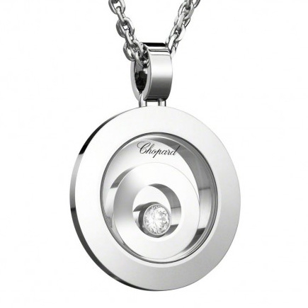 Подвеска Chopard Happy Spirit ref: 795405-1001 из белого золота 750 пробы с бриллиантом (0,10 карат), который свободно скользит между двумя сапфировыми стеклами.