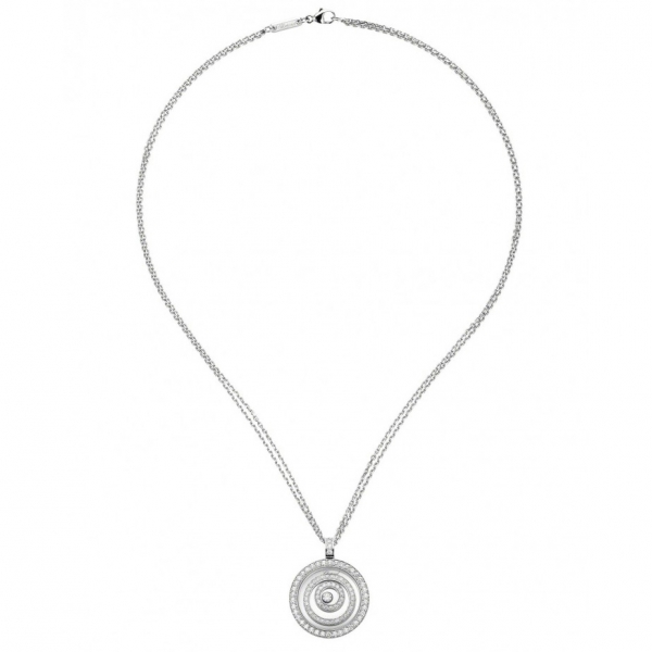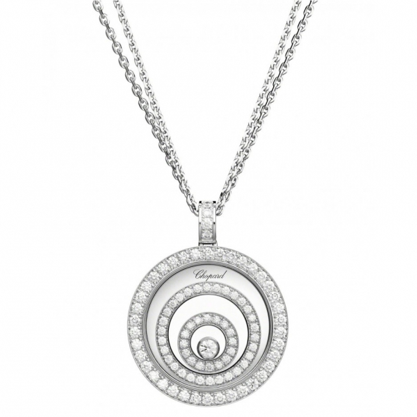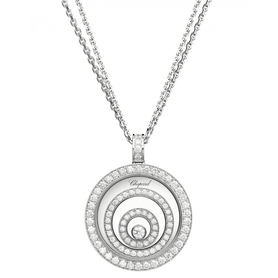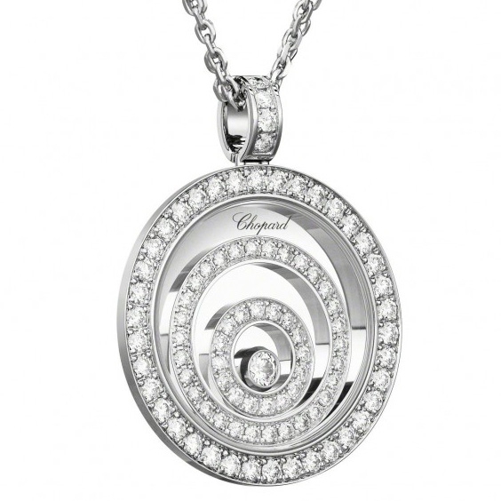 Подвеска Chopard Happy Spirit ref: 795425-1001 из белого золота 750 пробы с бриллиантами (1,20 карат), плавающие бриллианты свободно скользят между двумя сапфировыми стеклами.