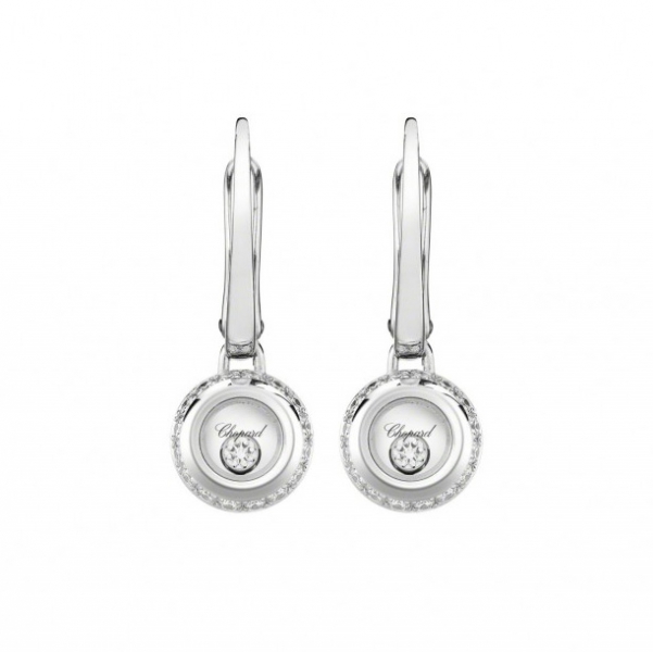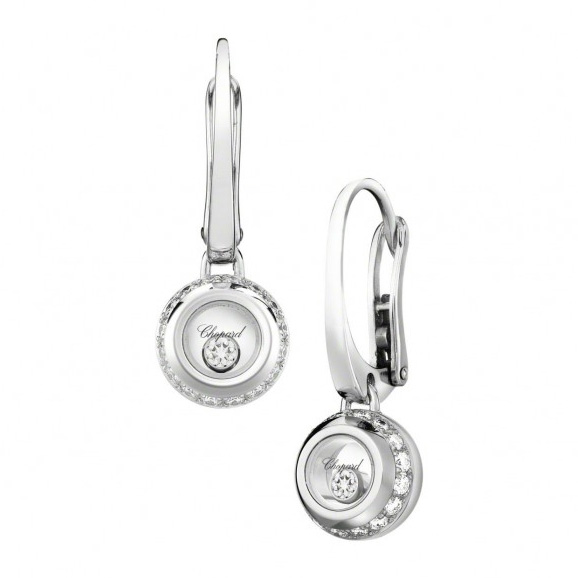 Серьги Chopard Miss Happy ref: 839013-1001 из белого золота 750 пробы с бриллиантами (0,28 карат), плавающие бриллианты свободно скользят между сапфировыми стеклами.