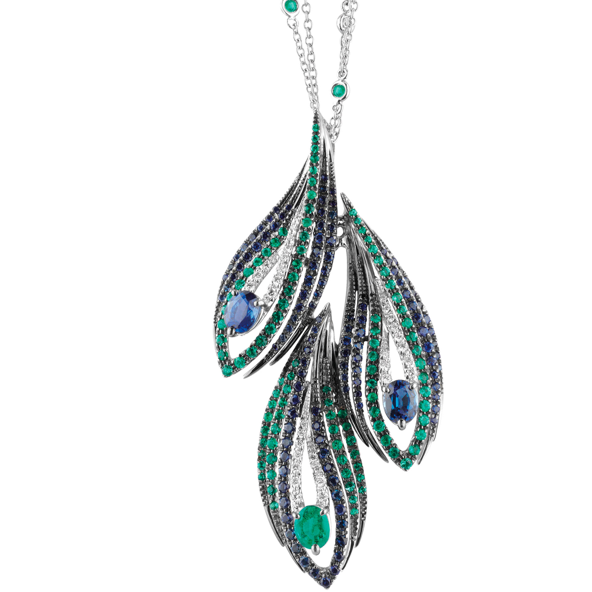 Колье Damiani Masterpieces Peacock из белого золота с бриллиантами (ct 0,57), сапфирами и изумрудами (ct 3,83).