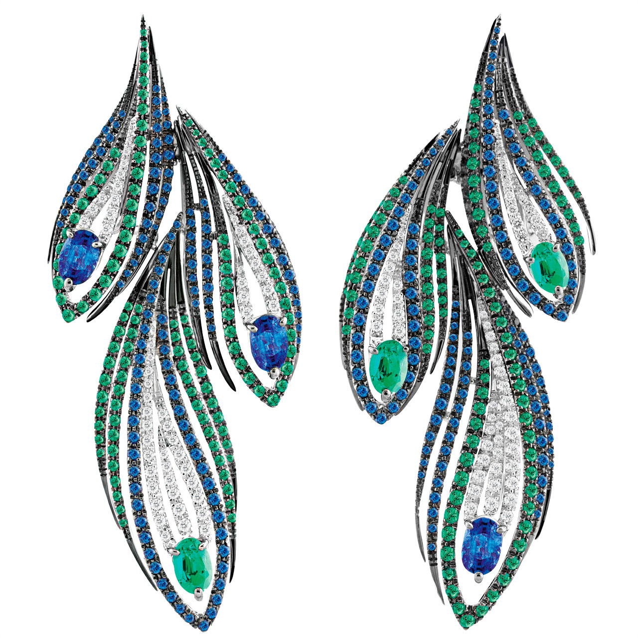 Серьги Damiani Masterpieces Peacock из белого золота с бриллиантами (ct 0,71), сапфирами и изумрудами (ct 7,27).