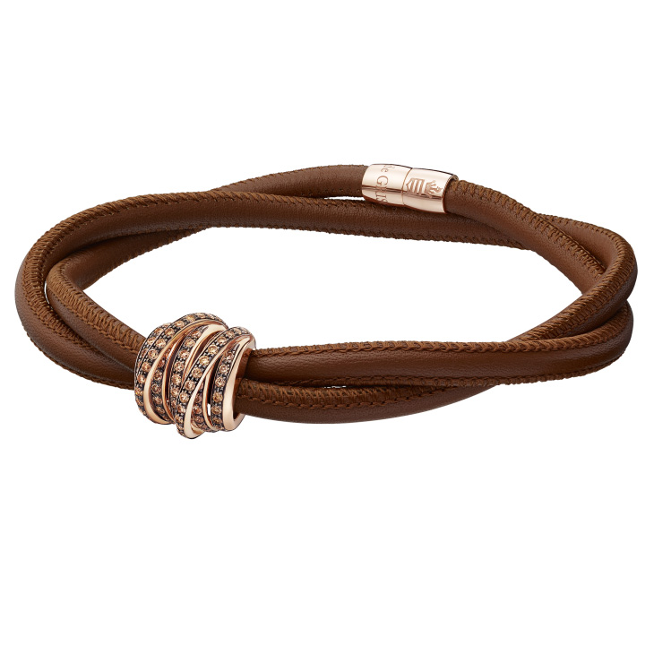Браслет de Grisogono, коллекция Allegra. Шнурок из кожи коричневого цвета, с элементами из розового золота 750 пробы и коричневыми бриллиантами.