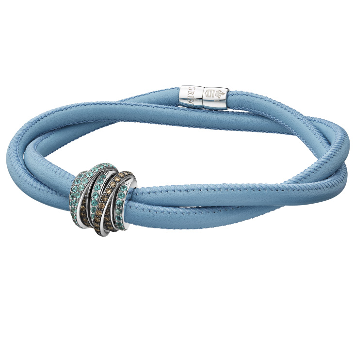 Браслет de Grisogono, коллекция Allegra. Шнурок из кожи голубого цвета, с элементами из белого золота 750 пробы, турмалинами Параиба и коричневыми бриллиантами.