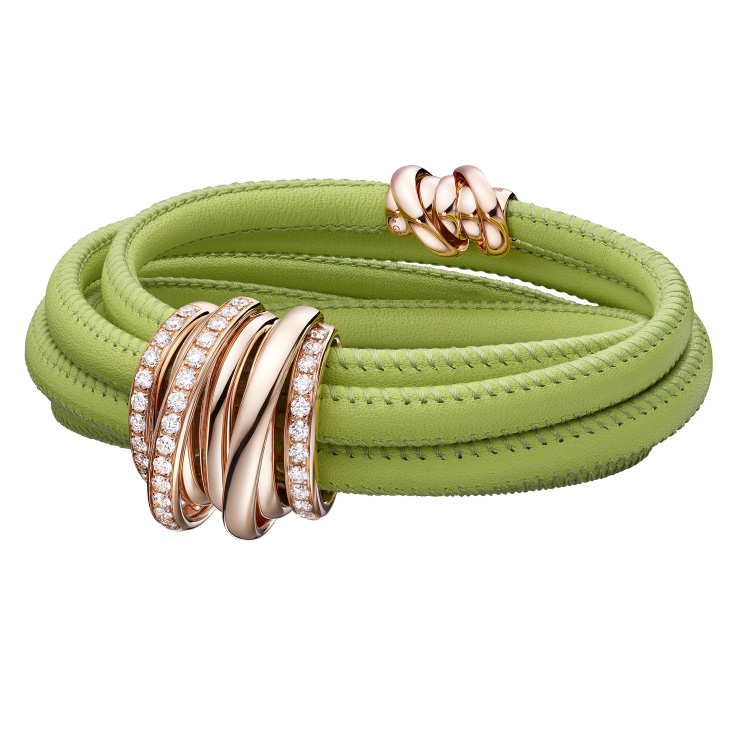 Браслет de Grisogono, коллекция Allegra. Шнурок из кожи салатового цвета, с элементами из розового золота 750 пробы и белыми бриллиантами.