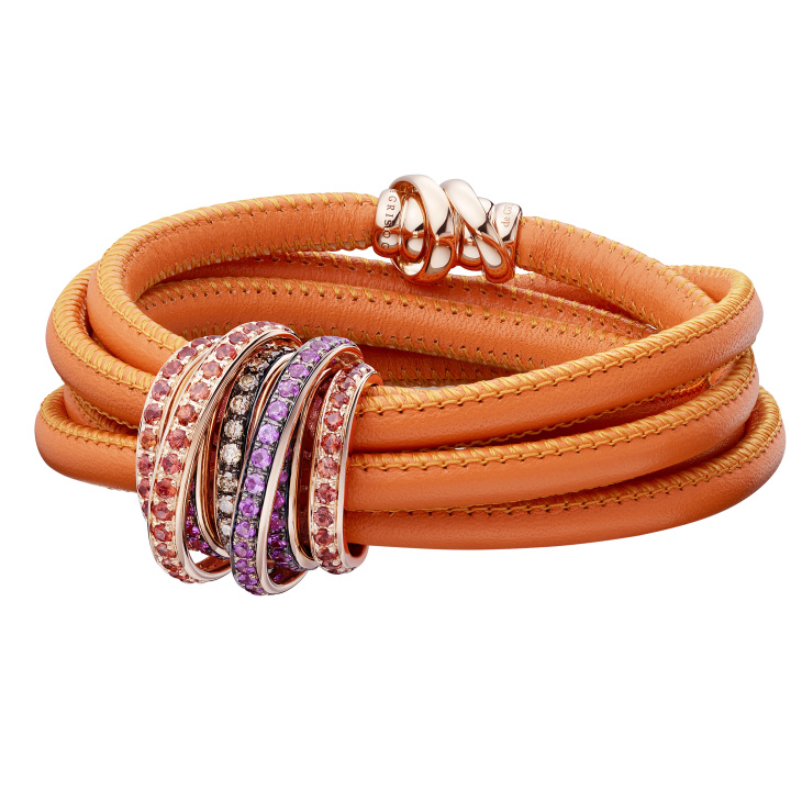 Браслет de Grisogono, коллекция Allegra. Шнурок из кожи коричневого цвета, с элементами из розового золота 750 пробы, коричневыми бриллиантами, оранжевыми и розовыми сапфирами.