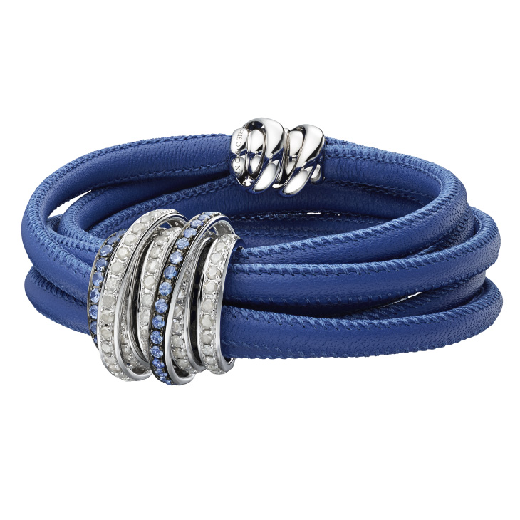 Браслет de Grisogono, коллекция Allegra. Шнурок из кожи синего цвета, с элементами из белого золота 750 пробы, белыми бриллиантами Icy и синими сапфирами.
