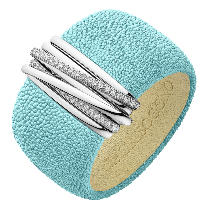 Браслет de Grisogono, коллекция Allegra. Браслет из кожи ската бирюзового цвета с элементами из белого золота 750 пробы и белыми бриллиантами.
