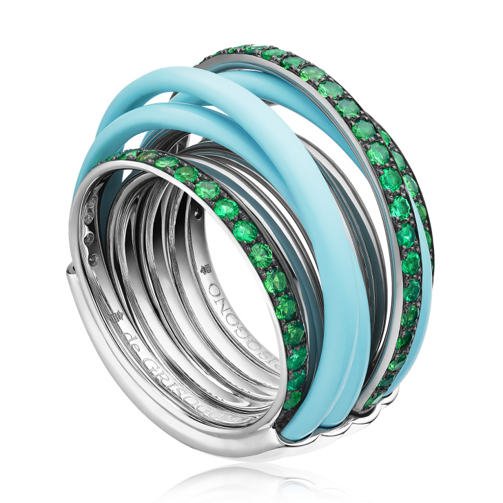 Кольцо de Grisogono, коллекция Allegra. Кольцо из белого золота и бирюзовой керамики с цаворитами.