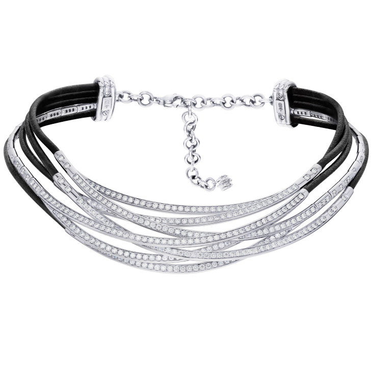 Колье de Grisogono, коллекция Allegra. Колье (Choker) из белого золота 750 пробы и кожи с белыми бриллиантами.