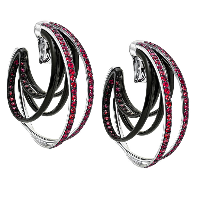 Серьги de Grisogono, коллекция Allegra. Серьги из белого золота и сплава Avional с черным нанокерамическим покрытием с рубинами.