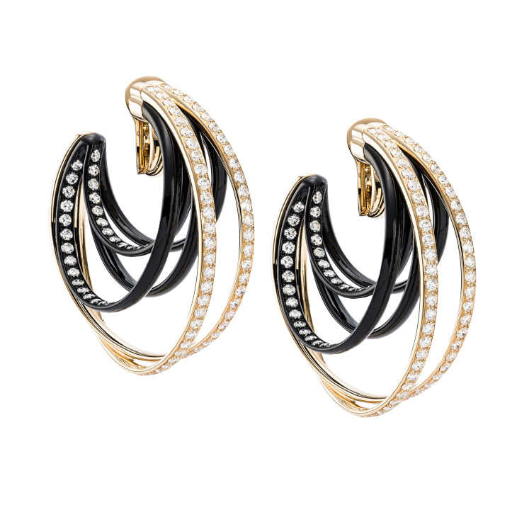 Серьги de Grisogono, коллекция Allegra. Серьги из желтого золота и сплава Avional с черным нанокерамическим покрытием с белыми бриллиантами.